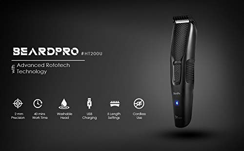 Now give a neat and clean look to your beard easily at home with this remarkable feature-loaded SYSKA HT200U beard trimmer. It tops the list every time when it comes to choosing the best trimmer out of this range as It is a very lightweight trimmer loaded with several features and a good option if you are looking for a pocket-friendly and efficient trimmer. Put on any style you want and try different styles like Goatee, short box beard, anchor beard, chevron, 3-day stubble, chin strip beard, full-length beard and many more. It is equipped with very durable stainless steel self-sharpening blades with advanced Rototech technology and ceramic cutting edge which remains sharper for a longer time period and gives inch perfect cut every time. Also, it gets sharper and more efficient after every use as it grinds against each other to give a precise and efficient trimming experience. Besides, It comes with 5 comb length adjustment settings that come with 4 stubble comb attachments of 1mm, 3mm, 5mm, 7mm with 2mm precision. Experience the smooth and even less noisy trimming sessions with its extremely quiet motor. Also, it offers you hassle-free smart USB fast charging which takes only 6 hours to charge completely and gives you 40 minutes of uninterrupted cordless use. Additionally, it also has a battery charge indicator that shows the battery status as well as charging status while charging whether it is low, empty, full or charging. Moreover, The trimmer has an ergonomic design for an easy and firm grip. In addition to this, you will get key accessories like 4 stubble comb, cleaning brush, blade oil and a USB charging cable